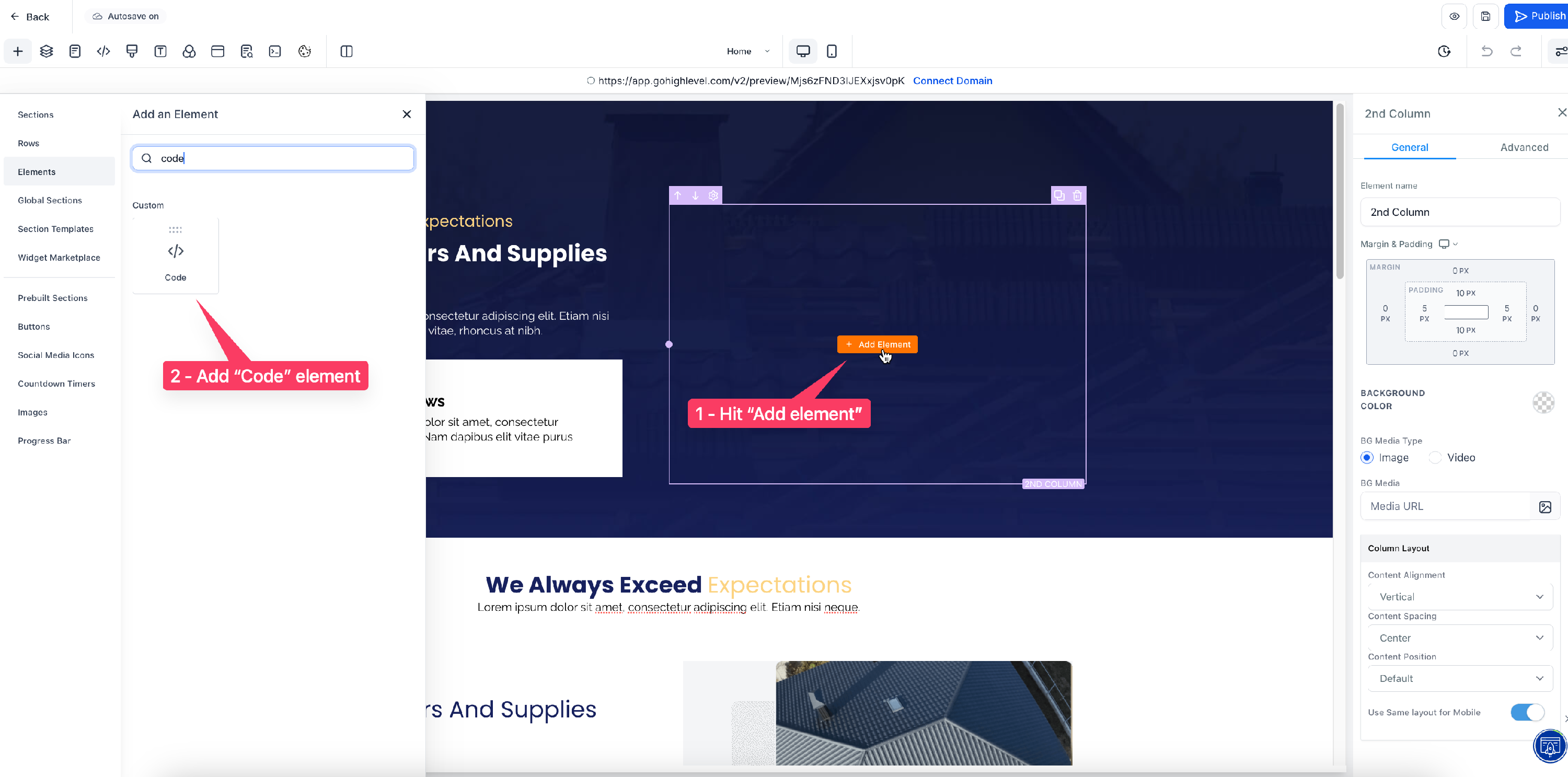 2.) Open up the HighLevel landing page builder, under "Sites" in your chosen sub-account. Find an empty space and hit the orange "Add element" button, before searching "Code" in the left and hitting the "Code" element: