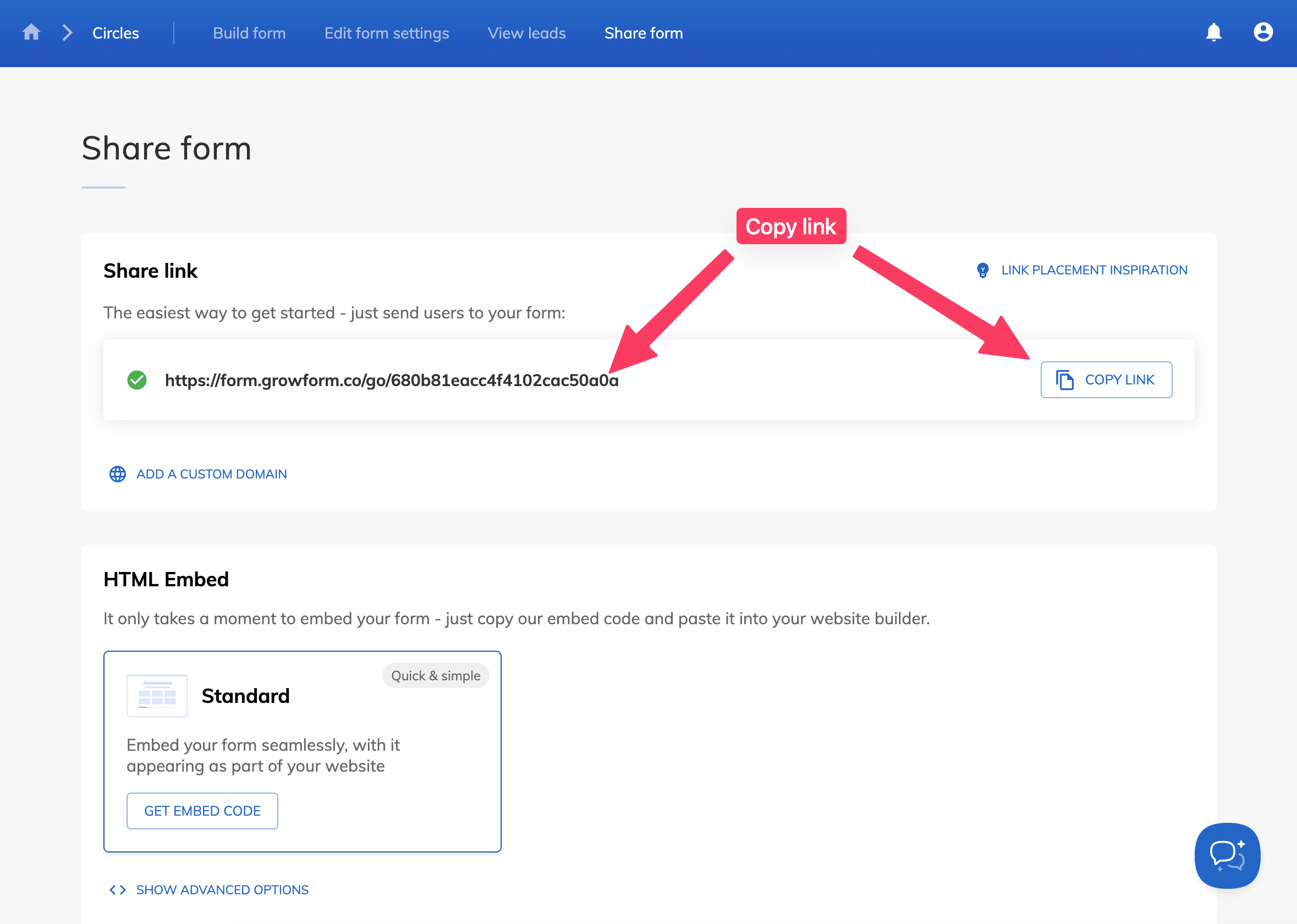 Open your form in the Growform builder, and hit "Share form". You can copy your form link to the clipboard by highlighting it, or hitting the "copy link" button:
